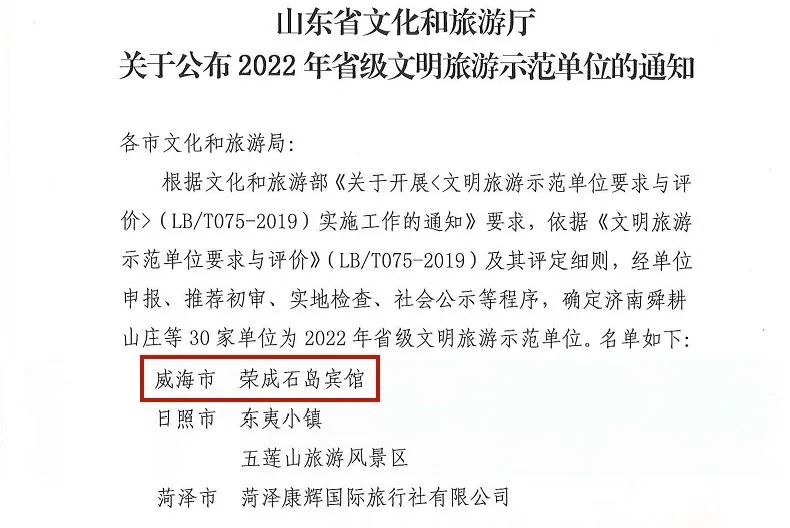 【概要描述】山(shān)东省文(wén)化和旅游厅公布了2022年省级文(wén)明旅游示范单位名单,全省共30家单位上榜,石岛宾馆位列其中,是此次威海市唯一上榜单位。